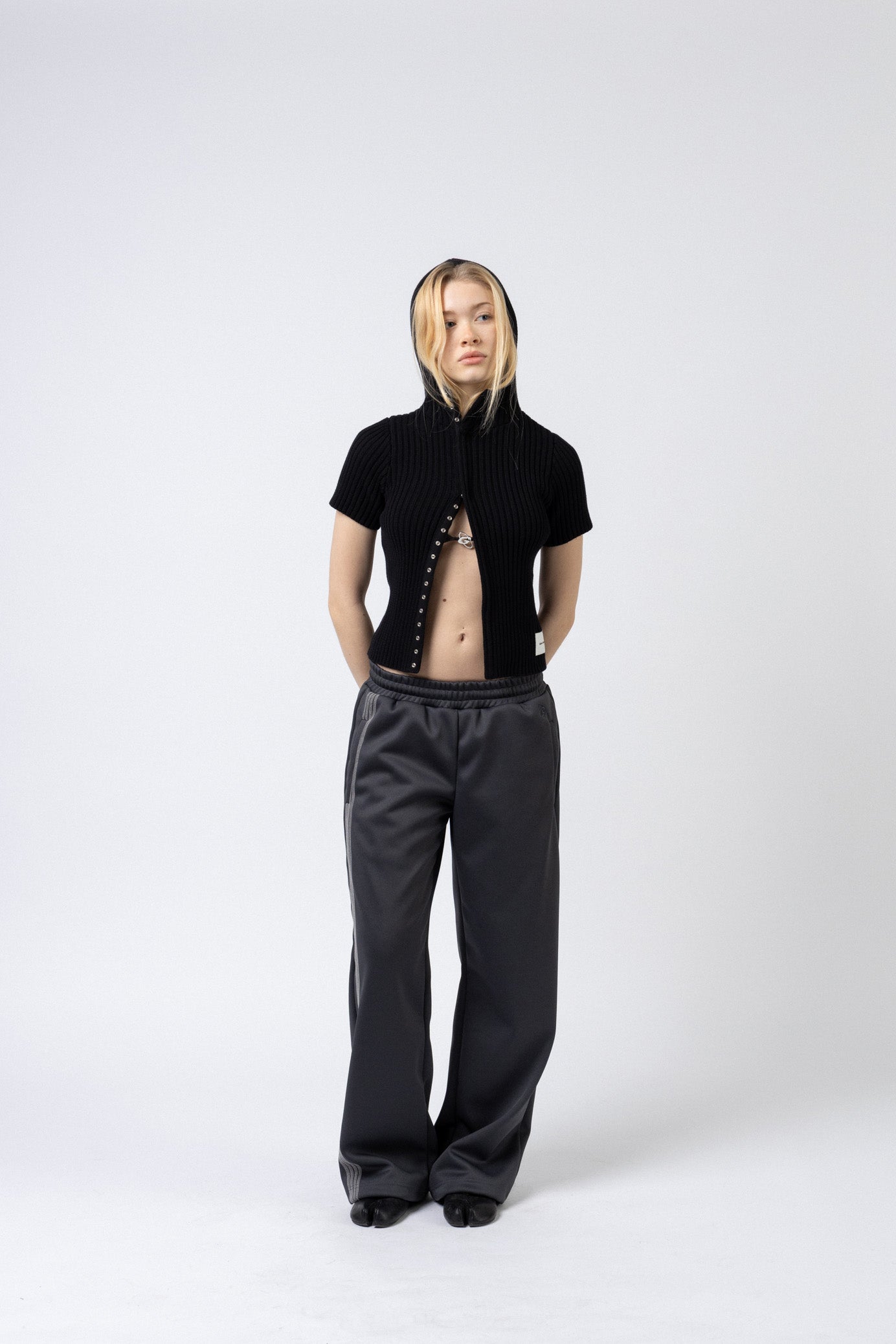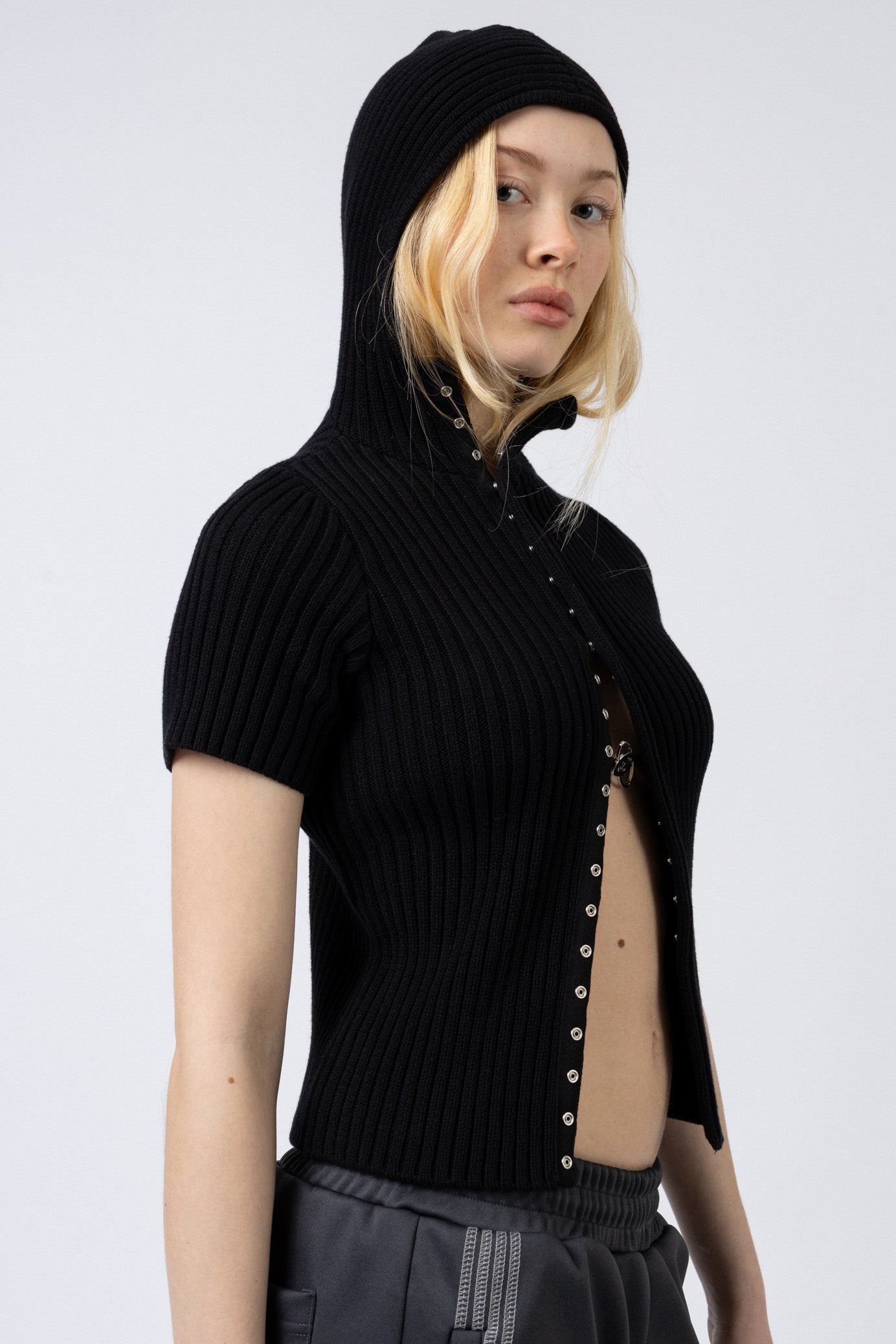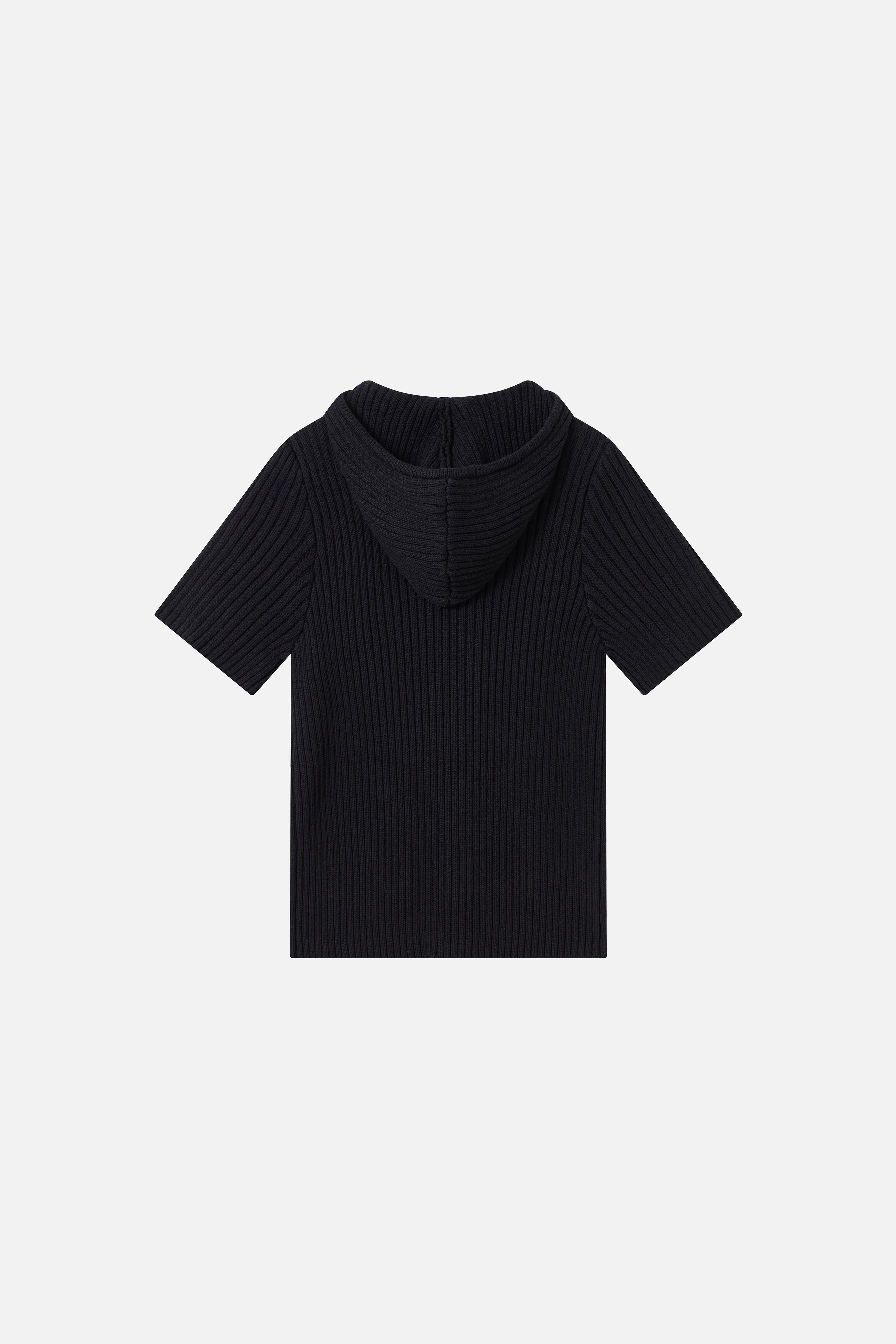 Knit Hoodie Top kommer i 100% cotton. Den tætsiddende pasform kombineret med korte ærmer og høj hals skaber et moderne og feminint udtryk.Frontlukningen med trykknapper giver mulighed for fleksibel styling.