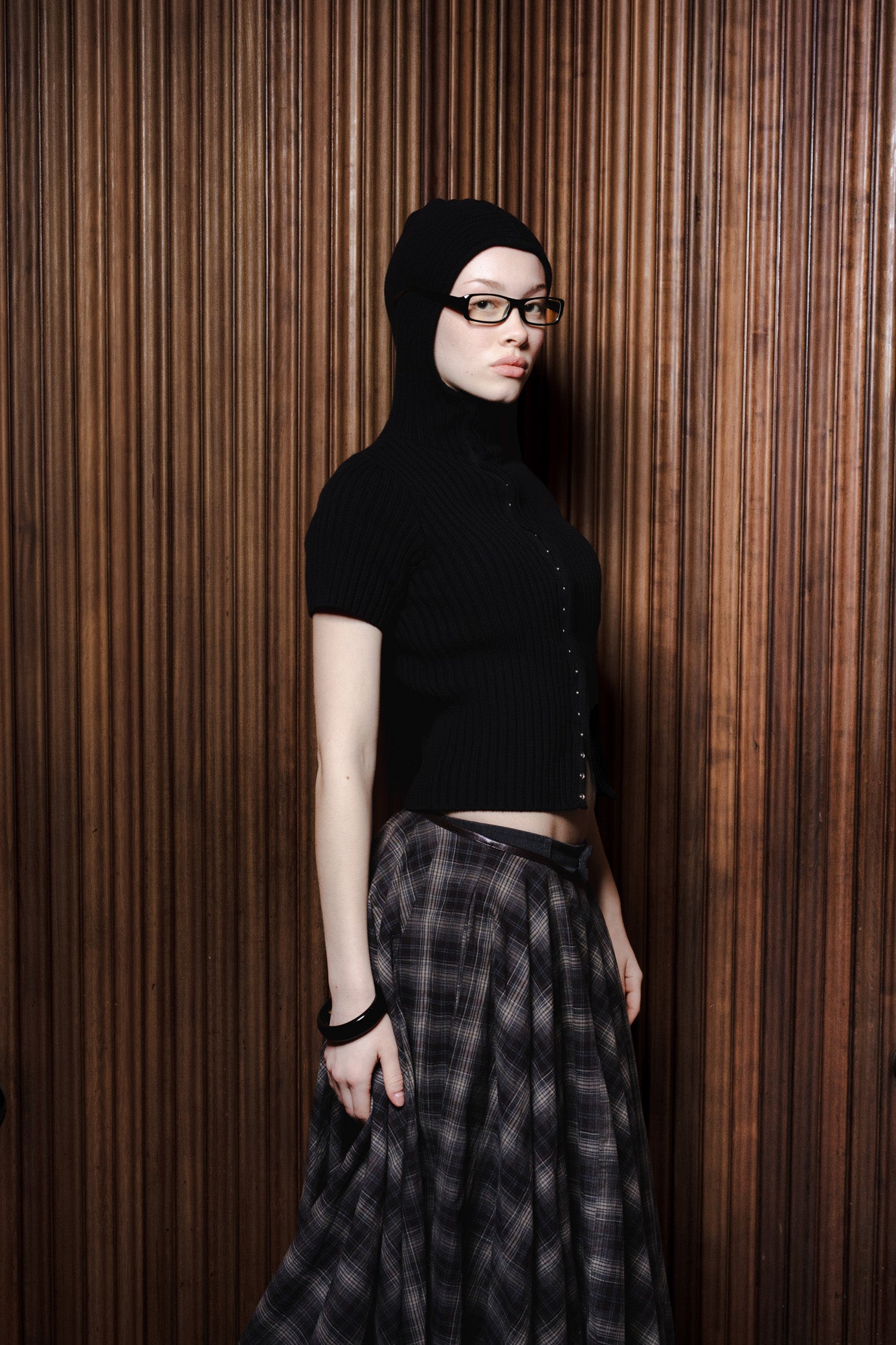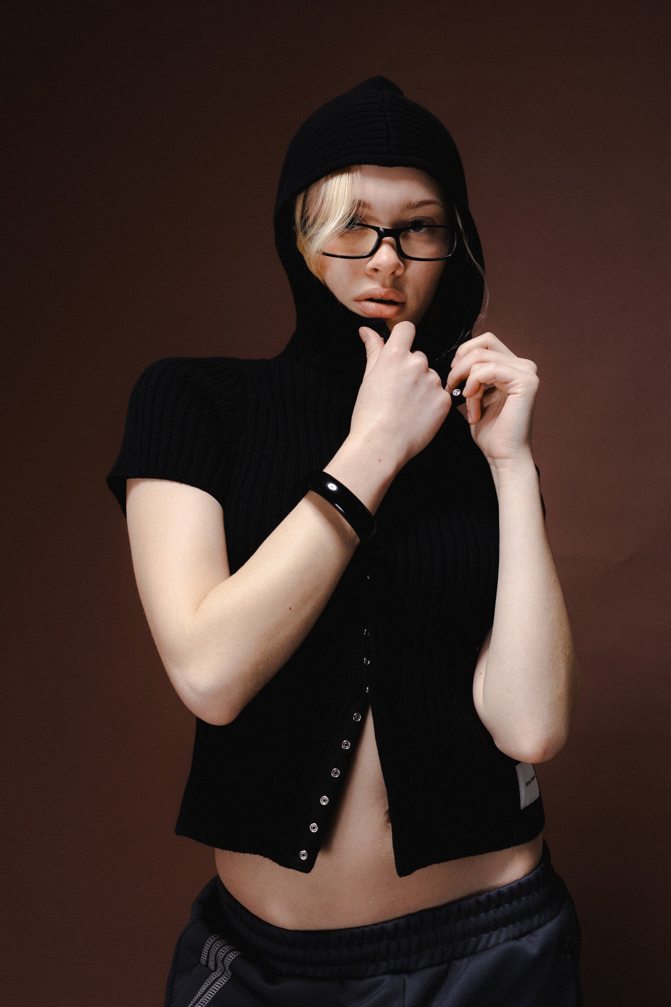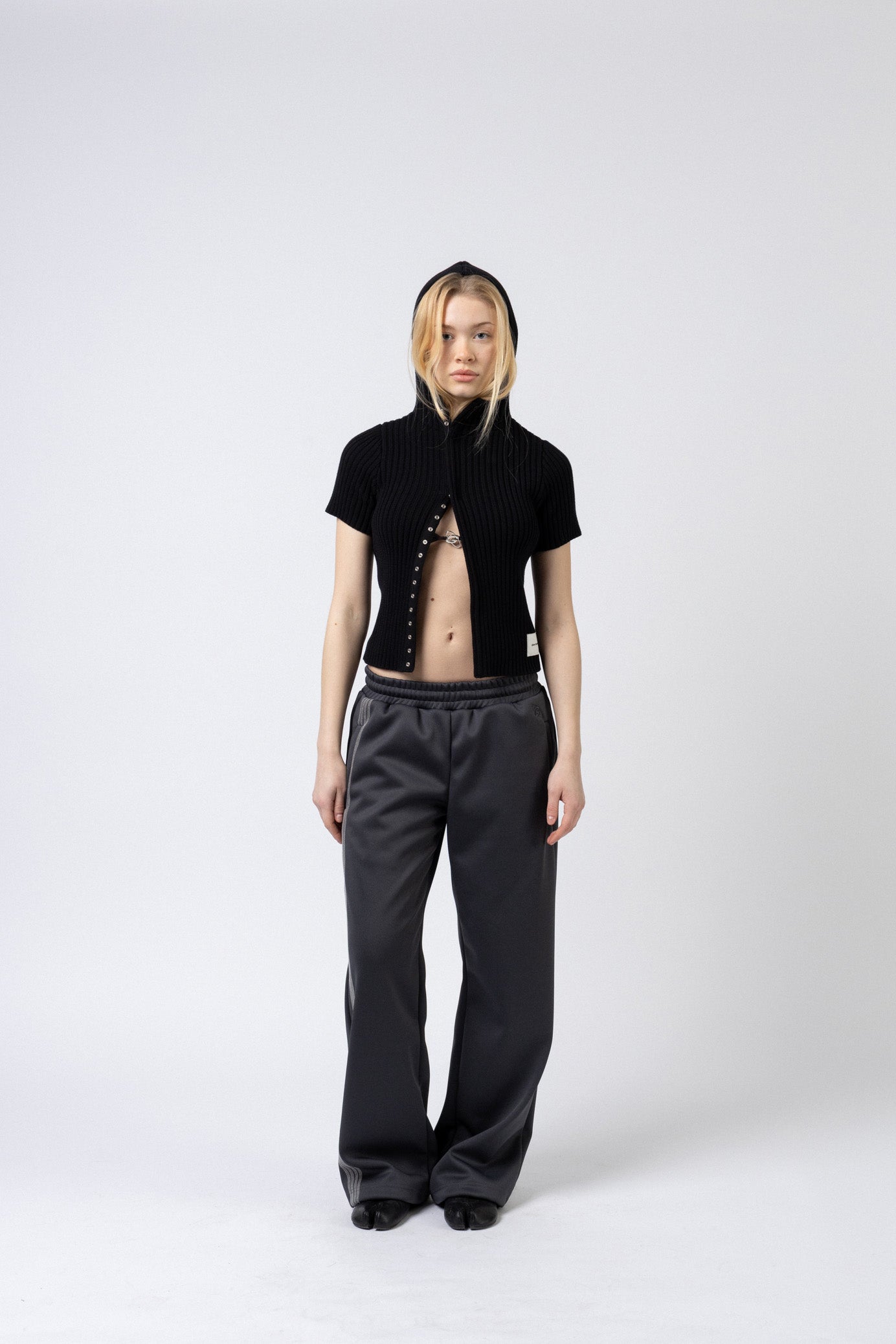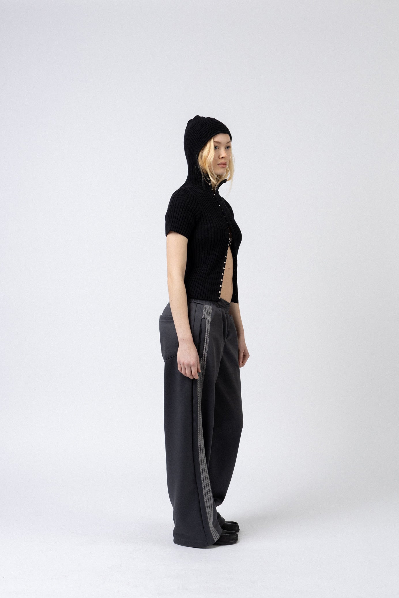Knit Hoodie Top kommer i 100% cotton. Den tætsiddende pasform kombineret med korte ærmer og høj hals skaber et moderne og feminint udtryk.Frontlukningen med trykknapper giver mulighed for fleksibel styling.