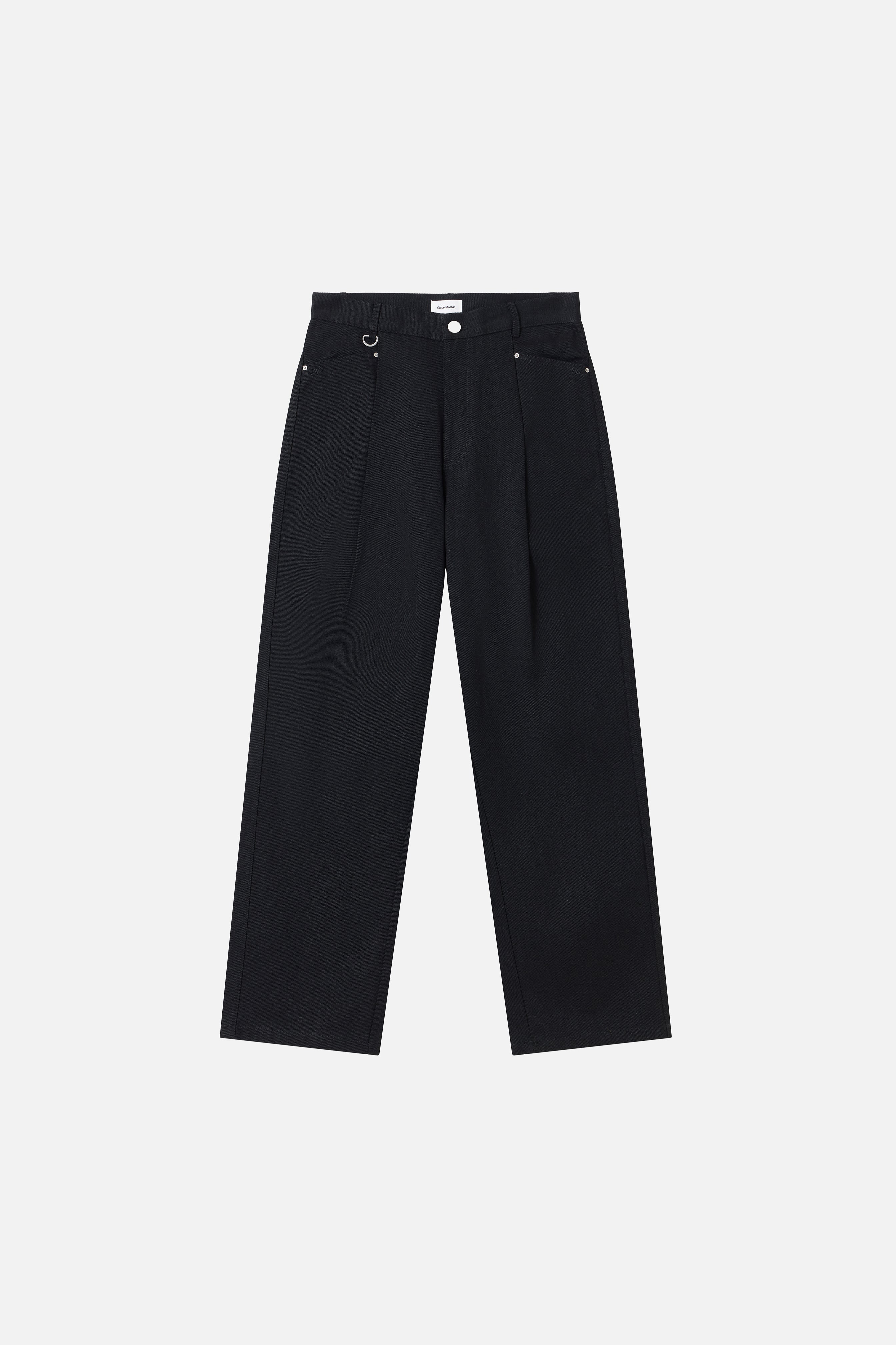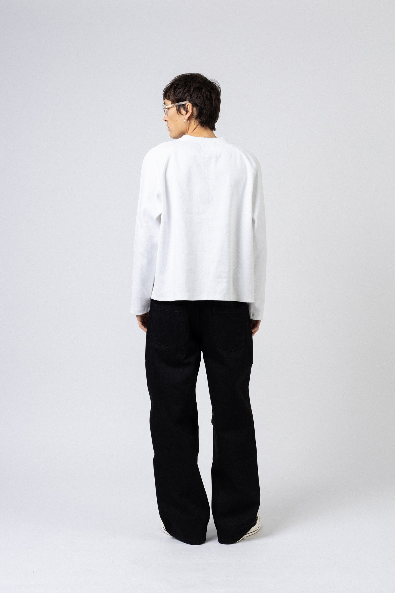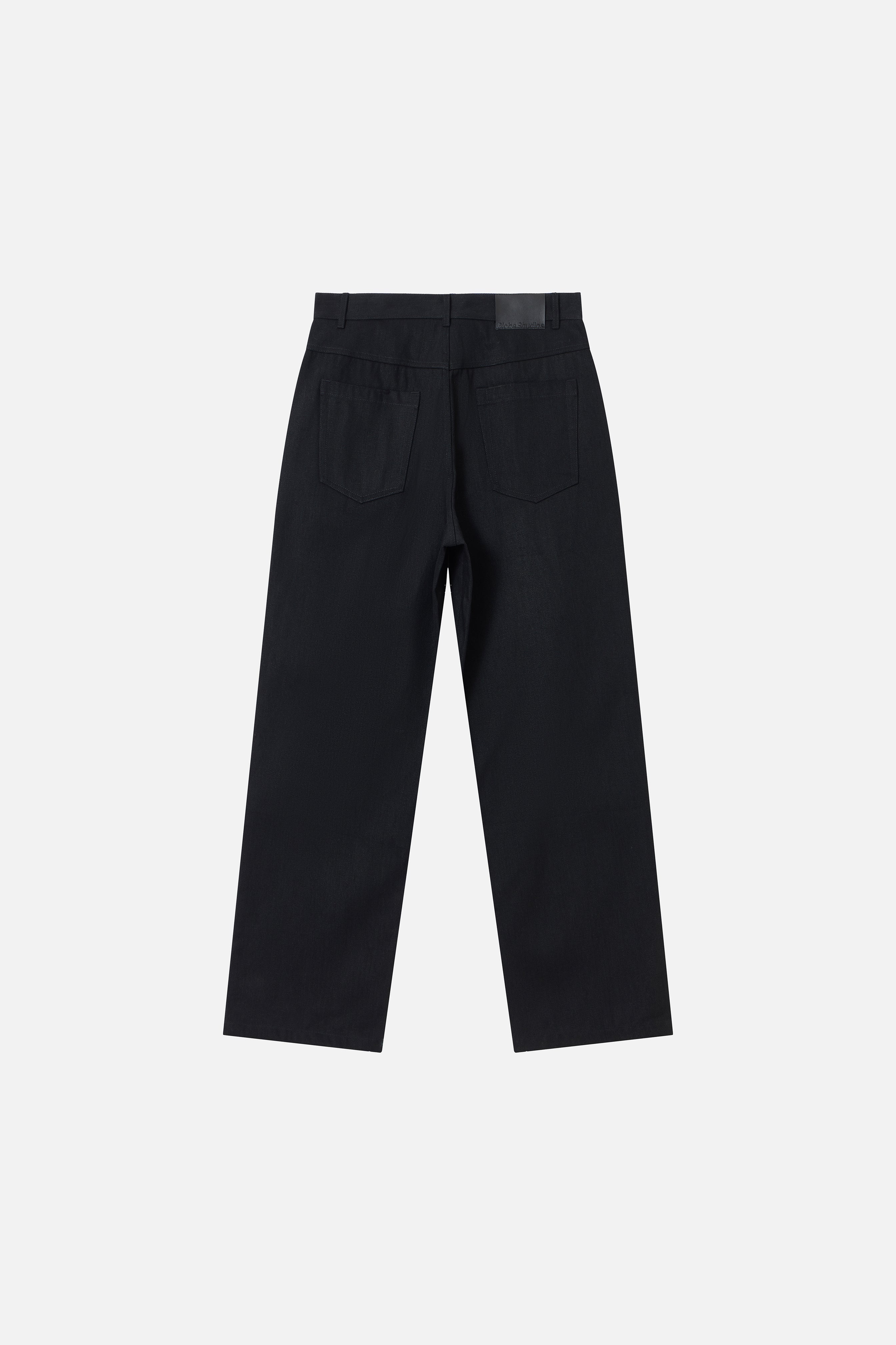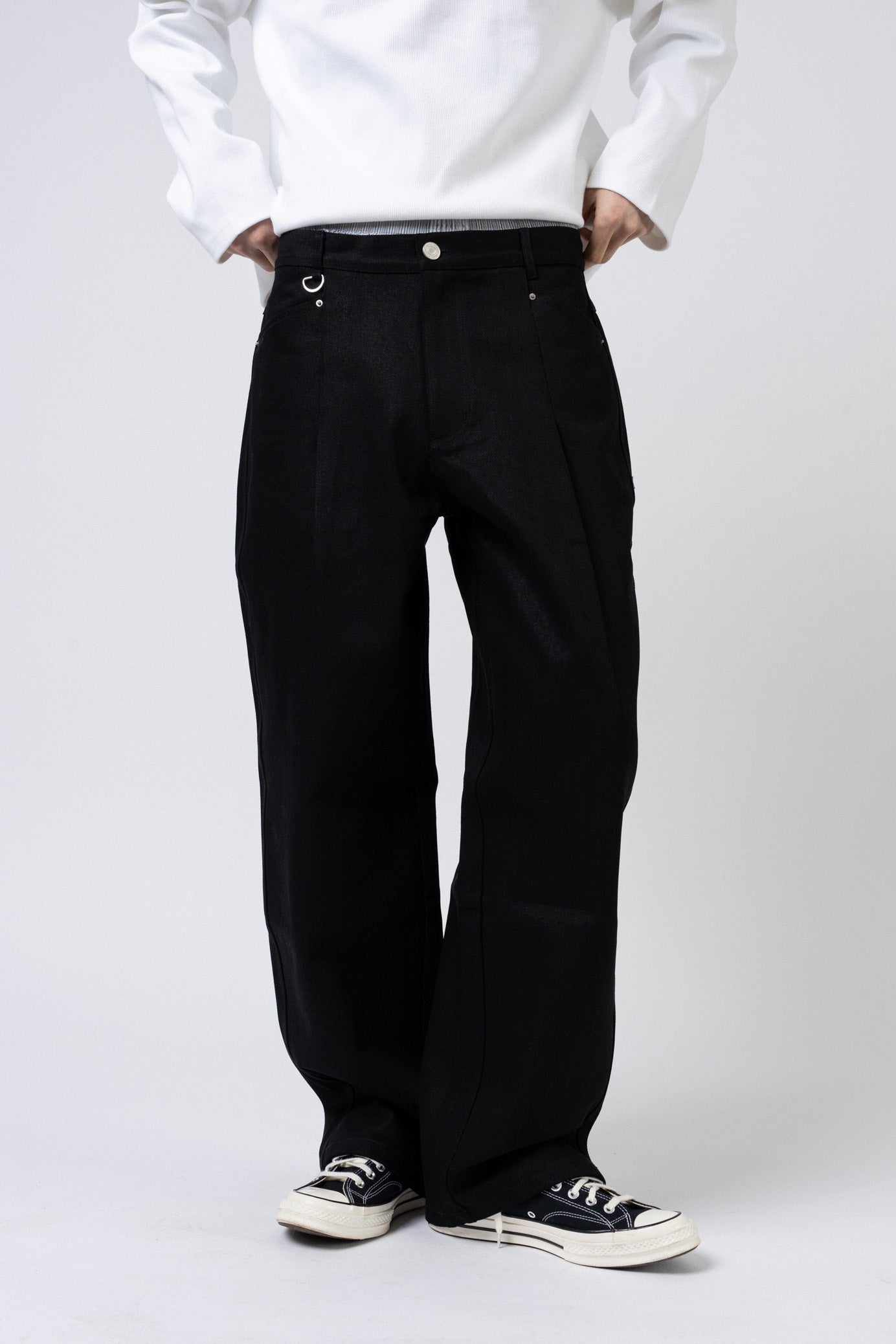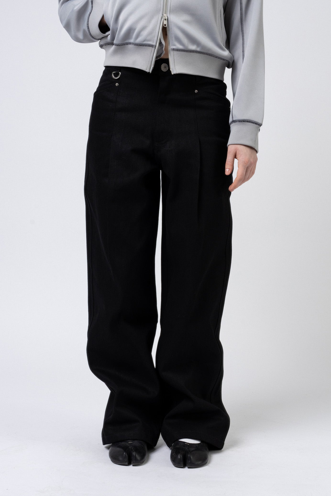 Raw Denim Jeans have a structured baggy fit with mid-waist, five classic pockets and contrast stitching.