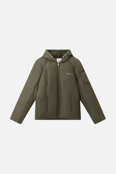 Our Winter Bomber Jacket is made from a water-repellent material that protects against rain and snow. The jacket has a cropped fit. The design is rounded off with an adjustable hood, practical zip pockets at the front, and a discreet pocket on the back, which adds a unique and functional element.